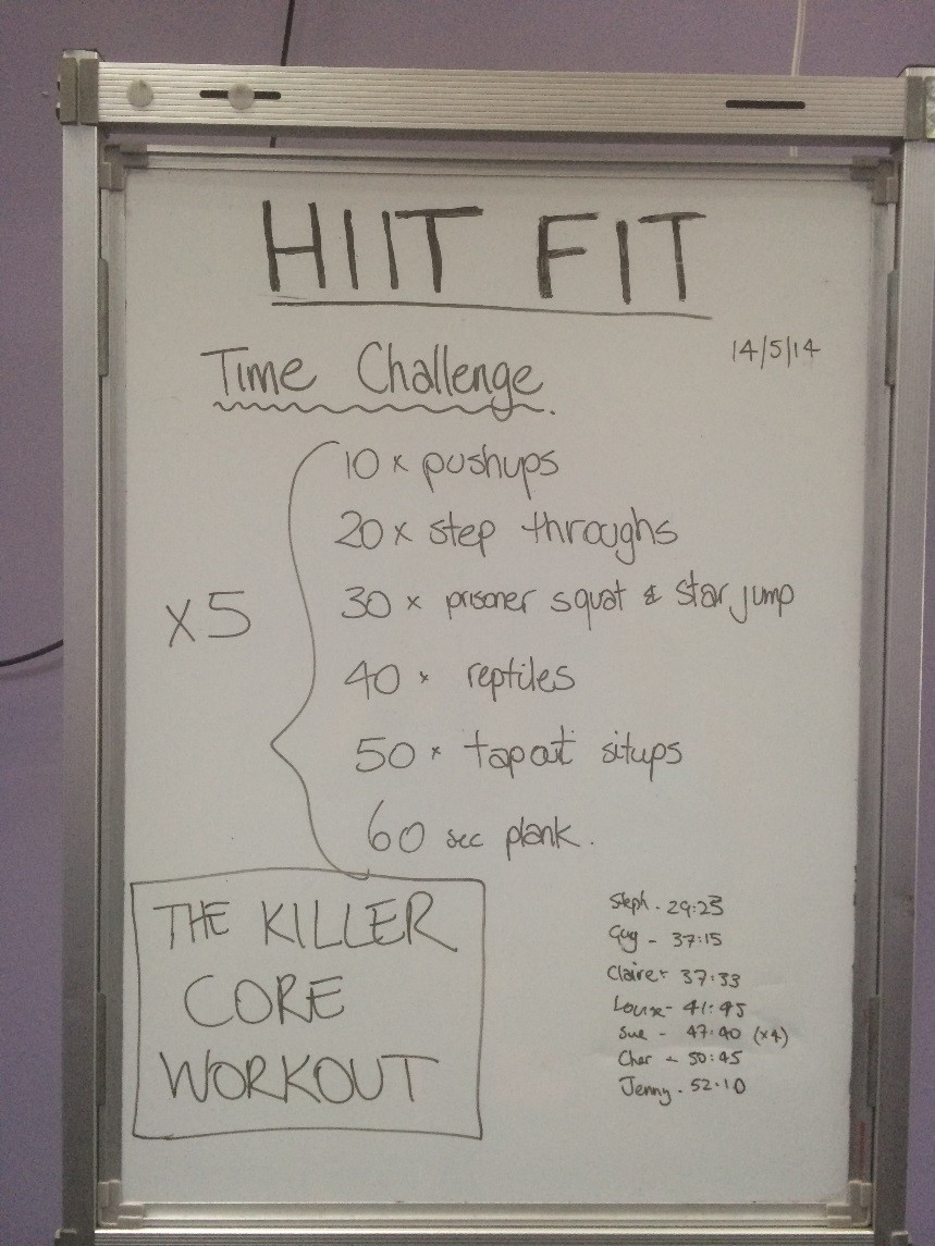 This took me approx 50mins to finish! However, I did stop and show some of my class members some alternatives, & correct their form etc. Having said that, my fittest and fastest class member did this in 29:25 followed by the next fittest in 37:10! This is a tough workout, but the moves are doable and low impact. You will definitely feel that you have used your core & abs, and you will have burnt HEAPS of calories! If 5 x through is too hard to begin with, do it 3 x through 🙂