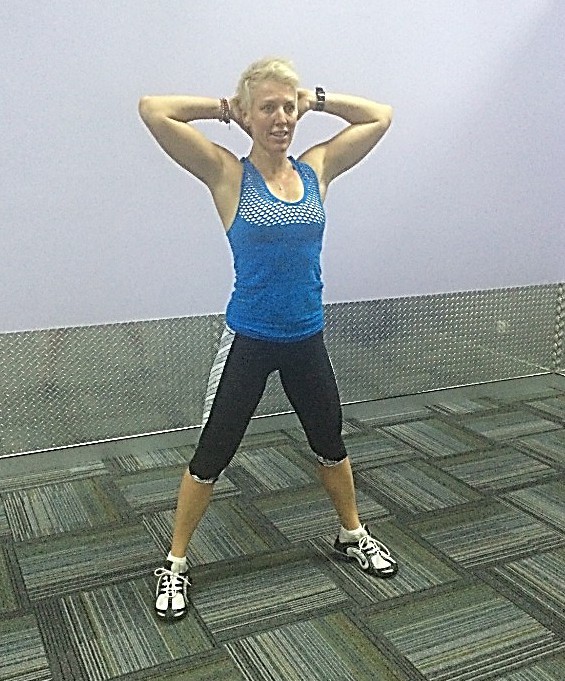 Jump up into a narrow feet stance with arms by your side then jump back out into a wide feet stance, as you place your hands behind your head again. Lower down into a deep squat. That is one rep.