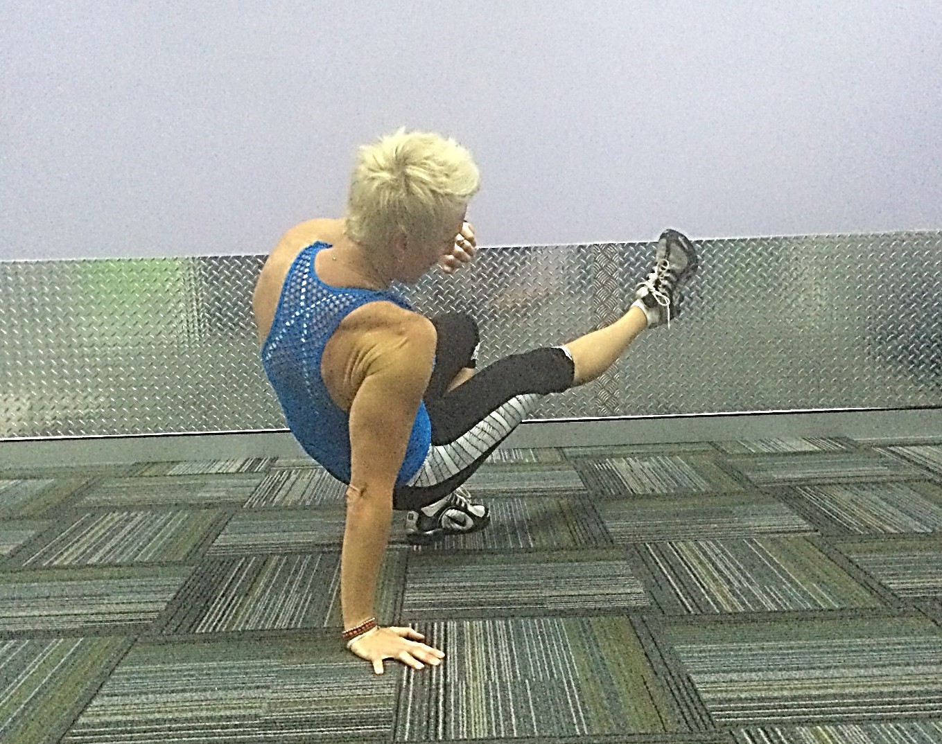 Start in a high plank position. Bring right leg up to right hand. Lift up right hand as you step you step your left leg through and kick out. Return to starting position. Alternate sides. Each step through is counted as 1 rep, so you will end up completing 10 kick throughs per side.